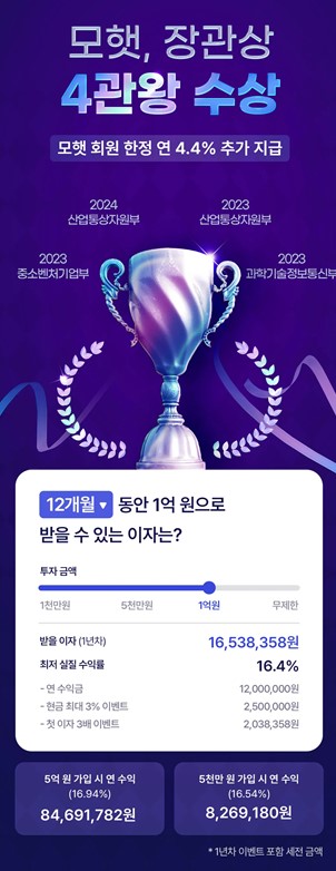 모햇은 한국전력, 포스코, 등의 협력업체들과 발전소 자산에 투자 해 안정된 투자 수익을 받는 상품입니다. 태양광 햇살에 투자 하는 모두의 햇살 투자 상품으로 폐쇄적인 에너지 사업에서 친환경 발전으로 얻는 수익에 개인이 참여하는 것입니다. 2023년에 이 상품은 에너지 신기술 혁신 부문 산업통상자원부 장관상을 수상하기도 했습니다. 2024년에는 기후 에너지 혁신상 산업부 장관상을 수상했으며 3년짜리 매월드림모햇플러스 상품은 누적투자액 1700억원을 돌파했다고 합니다.