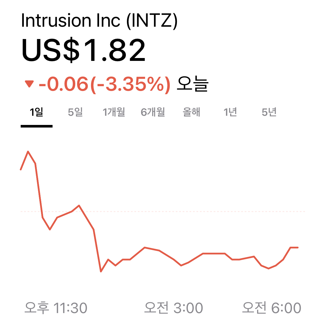 인트루전(Intrusion Inc., 티커: INTZ)은 사이버 보안 솔루션을 제공하는 기업으로, 최근 주가 변동이 두드러집니다. 현재 주가는 1.82달러로, 전일 대비 0.065달러(-3.46%) 하락하였습니다. 금일 최고가는 2.06달러, 최저가는 1.77달러였으며, 거래량은 1,435,342주를 기록하였습니다.